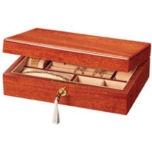 Make this stunning jewelry box a new addition to your jewelry collection. With natural mahogany wood, this beautiful jewelry box has rolls for your rings, many compartments for earrings or cufflinks and a classy gloss finish. Keep your jewelry safe and secure with the lock and key. This jewelry box would be the perfect gift for that special someone or for the avid jewelry collector.